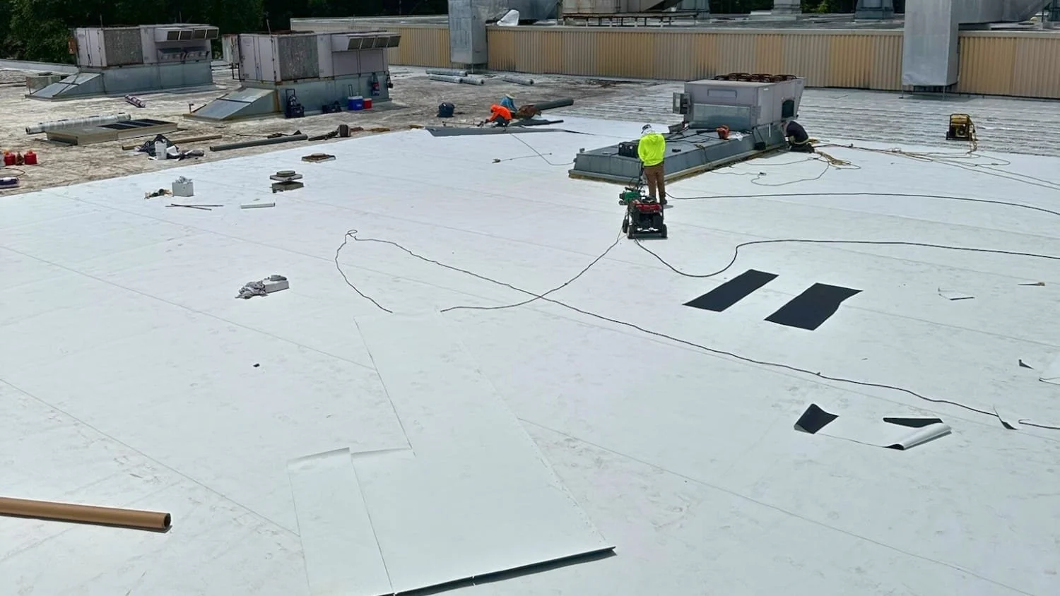 Once the surface is prepped, the TPO membrane is rolled out across the roof. These sheets come in varying widths, often reducing the need for seams.